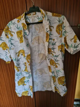 Camisa de manga corta con un llamativo estampado de tigres y hojas verdes sobre fondo blanco. - Diseño de tigres y vegetación. - Cuello camisero. - Cierre de botones.