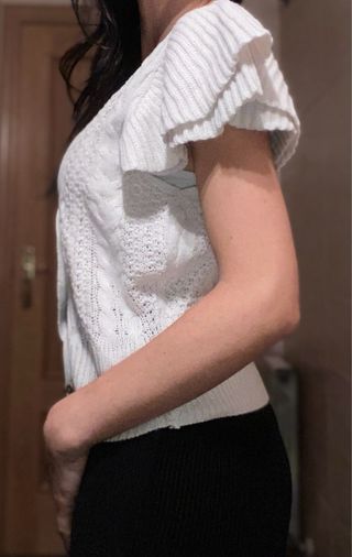 Cárdigan de punto con manga corta y escote en V. Presenta un diseño trenzado y botones frontales. - Tejido de punto acanalado en las mangas y con volantes. 🔅Largo 49cm.