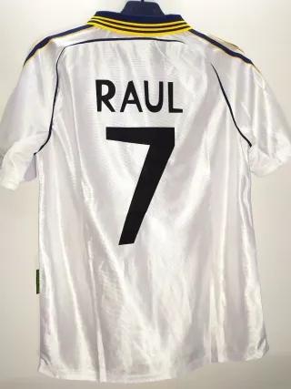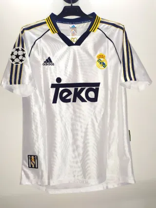 Camiseta de fútbol del Real Madrid de la temporada 1998-2000 talla XL totalmente nueva con su etiqueta. Diseño clásico con detalles en azul y amarillo. Escudo del club y logo de Adidas bordados. Parche de la Champions League en la manga y publicidad Teka Dorsal 7 de Raúl González Blanco Más camisetas en mi perfil #futbol #antigua #tshirt #soccer #football #Jersey #retro #vintage