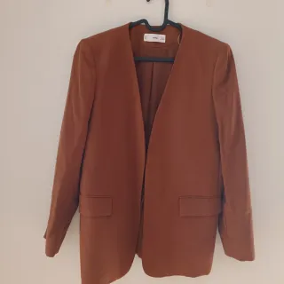 Elegante blazer de Mango en un bonito tono marrón. Su diseño sin cuello le da un toque moderno y sofisticado. - Corte abierto. - Dos bolsillos frontales. - Mangas largas.