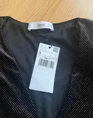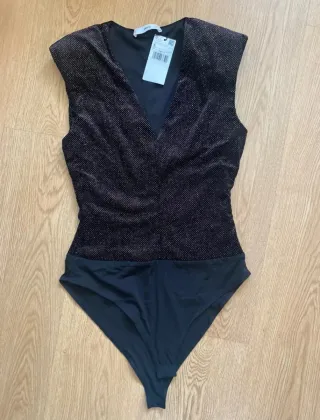Body diseño metalizado y hombreras Padbody. Talla S. Marca Mango. Nuevo. - Tejido con acabado brillante. - Escote en pico. - Mangas con hombreras - 90 % poliéster 10% elastano
