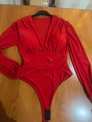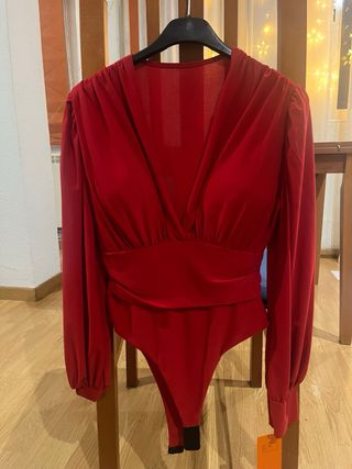 Body elegante de manga larga. - Escote pronunciado en V. - Detalle fruncido en la cintura. - Mangas abullonadas con puño. - Cierre de corchetes en la parte inferior.