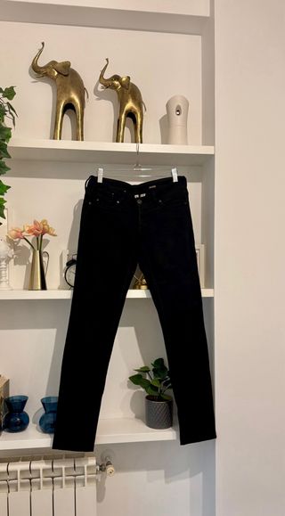Vaqueros de corte ajustado en color negro. - Diseño de cinco bolsillos. - Cierre con cremallera y botón.