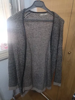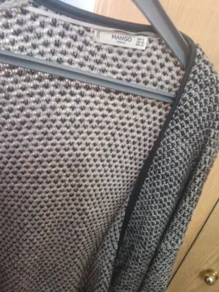 Cárdigan tejido de Mango con un diseño moderno. - Patrón de puntos en relieve. - Ribete negro en el frente. - Mangas largas. - Bajo y puños en punto. - Largo hasta la cadera.