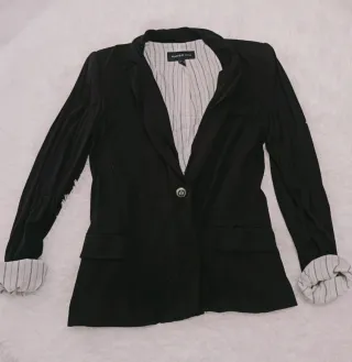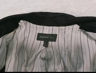 Elegante blazer negro de Mango, perfecto para cualquier ocasión. - Diseño de un solo botón. - Forro interior a rayas. - Puños enrollados con detalle de rayas. - Tiene algún descosido, pero se puede coser.