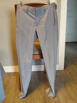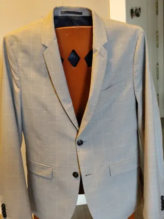Elegante traje de chaqueta de la marca Mango con un discreto estampado de cuadros. - Chaqueta de corte clásico. - Cierre de dos botones. - Bolsillos frontales con solapa. - Puños con botones. - Talla exacta en la foto. - Es Slim, para 178cm y complexión delgada. - Usado 2 veces.