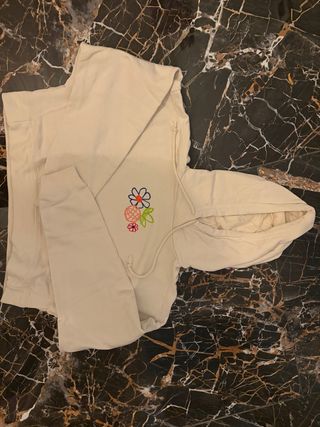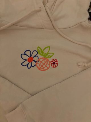 Sudadera corta de Adidas en color beige con un bonito bordado de flores en la parte delantera. - Diseño con capucha. - Cordones ajustables en la capucha. - Manga larga.