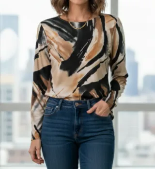 Camiseta de manga larga de la marca Inocuo Classico Nuovo en talla S. Diseño original con estampado abstracto en tonos tierra (ocre, marrón y negro). ✅ ESTADO: Muy bueno, muy poco uso. Sin manchas, ni roces, ni enganchones. DETALLE: El remate del hilo en la zona interior del cuello está algo suelto (se ve en la última foto). No afecta al uso y se puede arreglar fácilmente con una puntada, pero prefiero avisar. Por eso ajusto un poco el precio. Tejido: Muy suave con caída. Estilo: Ideal para jeans negros o look de vestir. 💵 Precio negociable. Acepto ofertas razonables. 📦 Entrega en mano o envío a domicilio. GRACIAS por tu visita!!