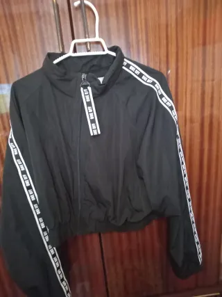Chaqueta corta negra con detalles de cinta. - Cremallera frontal. - Puños y bajo elásticos. - Cinta con logo en mangas y tirador.