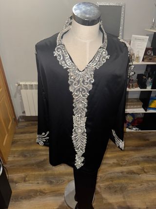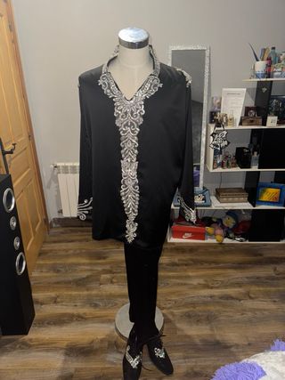 Elegante traje de novio gitano con detalles en plata. Trae camisa de pedreria , pantalon y zapatos a juego - Diseño con pedrería. - Cuello adornado. - Mangas con detalles. - Corte moderno.