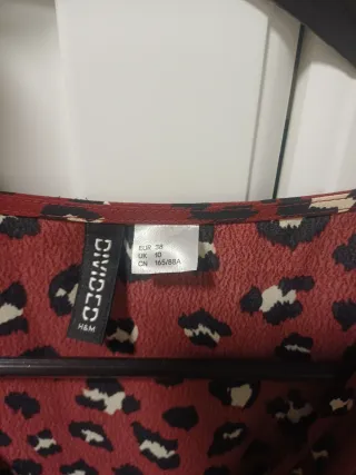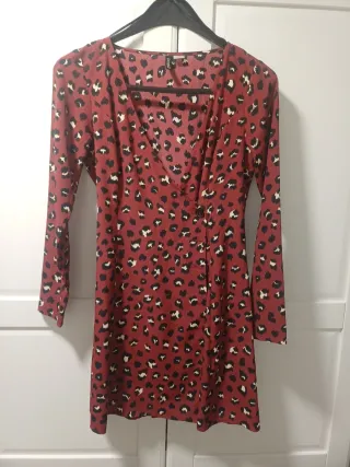 Vestido corto con estampado de leopardo en tonos granates. Diseño cruzado con manga larga y un botón. - Estampado de leopardo. - Cuello en V. - Manga larga. - Cierre cruzado con botón.