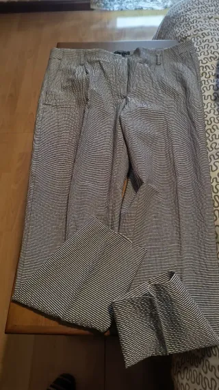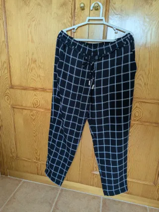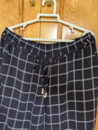 Pantalón de mujer de vestir con estampado de cuadros. - Diseño de cuadros blancos sobre fondo azul marino. - Cintura con cordón ajustable. - Corte recto. - Solo usado un par de veces.