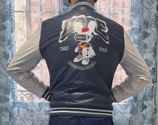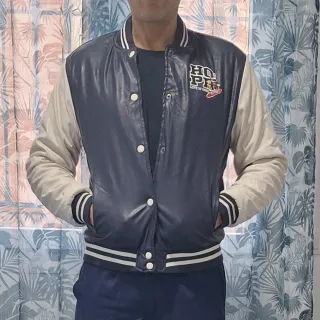Chaqueta estilo bomber universitaria con un diseño moderno. - Cuerpo principal en azul. - Mangas en color beige. - Puños y cuello con detalles de rayas.