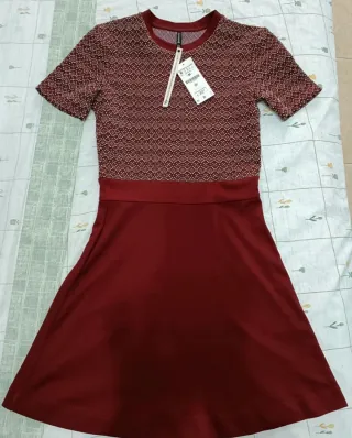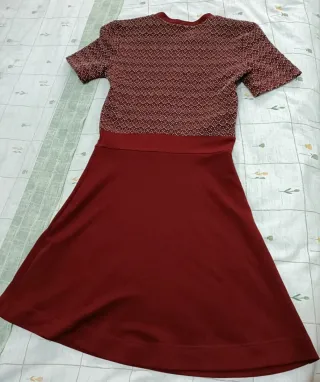 Vestido de fiesta de la marca Stradivarius.de color granate en la parte de arriba lleva hilo en color dorado - Diseño con cuerpo de punto texturizado. - Falda de corte evasé. - Manga corta pongo fotos de medidas