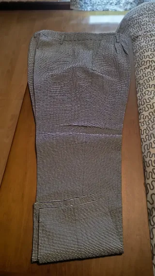 Pantalones de vestir con un diseño de rayas finas en tonos azules. - Cintura con trabillas para cinturón. - Cierre de cremallera y botón. - Bolsillos laterales. - Bolsillos traseros. - Tejido ligero.