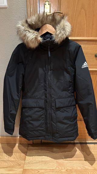Parka de invierno Adidas para mujer con un diseño moderno y cálido. Cuenta con un forro de pelo sintético en la capucha para mayor confort. - Cierre de cremallera frontal. - Dos bolsillos inferiores con solapa. - Logo de Adidas en la manga.