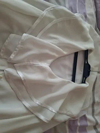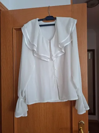 Elegante blusa blanca con volantes en cuello y puños. Talla 38/40 - Cuello con doble volante. - Mangas acampanadas con volantes. - Cierre de botones. - Tejido ligero y vaporoso.