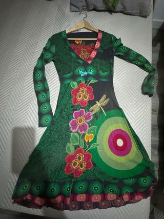 Vestido de manga larga con un estampado vibrante y llamativo. - Diseño con cuello en V. - Estampado floral y de libélula. - Detalles de círculos concéntricos en la falda. - Bajo con volantes y estampado de círculos.