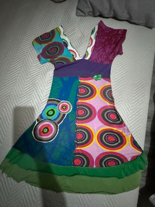 Vestido elegante sin estrenar con un diseño llamativo. - Detalle de flecos en las mangas. - Escote pronunciado en V. - Abertura lateral en la falda.