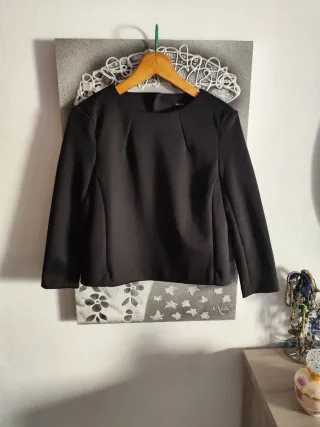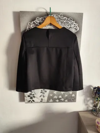 Blusa con hilo metalizado de tejido fluido. Escote de pico, cierre oculto de botones en la parte delantera, lazo desmontable a la cintura, manga larga y puños abotonados con ribetes de crochet. Marca Mango. Color negro. Talla L Precio en tienda 29,99€ Medidas: Hombro 41 cm, sisa 58 cm, largo 70 cm.