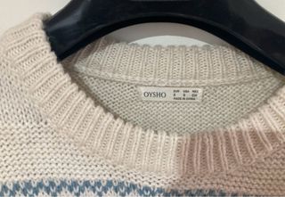 Jersey de punto fino con cuello alto y manga larga abullonada. Indica talla L pero a mí me va perfecto y tengo una S. - Tejido acanalado. - Corte cropped. - Cuello con volante.