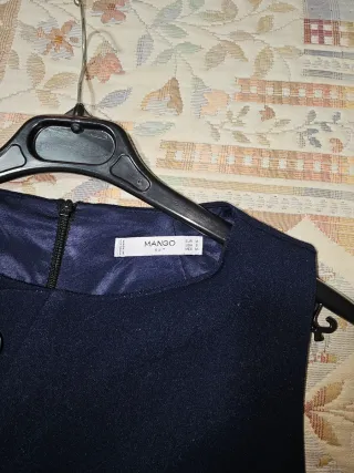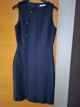 Elegante vestido azul marino sin mangas para mujer. - Diseño entallado. - Cremallera en la espalda. -Botones adorno parte delantera. -Con forro - Largo 1 metro
