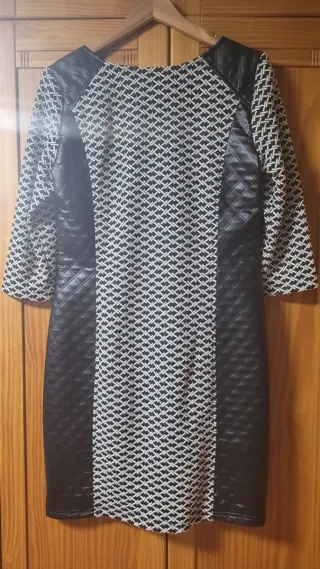 Vestido de media manga con un diseño moderno que combina tela estampada y efecto piel. - Diseño de media manga. - Combinación de estampado blanco y negro con paneles de efecto piel. - Cremallera frontal. Va forrado.