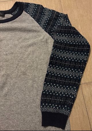 Jersey de Bershka con un diseño moderno y cómodo. - Mangas raglán con estampado geométrico en azul y blanco. - Cuerpo principal en color gris jaspeado. - Cuello redondo y puños de canalé.