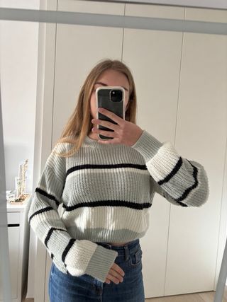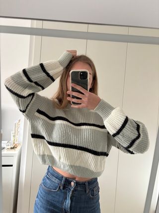 Jersey de punto con diseño de rayas horizontales. - Manga larga abullonada. - Cuello redondo. - Corte cropped.