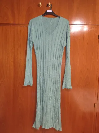 Vestido de punto largo en color verde de manga larga. Presenta un diseño de canalé vertical que estiliza la figura. - Cuello en pico. - Mangas largas acampanadas. - Tejido elástico.