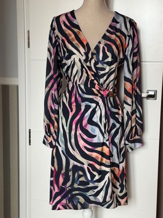Vestido con un llamativo estampado de cebra en tonos multicolor. Muy favorecedor, su diseño es cruzado en la parte superior con drapeado para recoger la cintura y falda pareo cerrada. Manga larga semitransparente. Diseñado y fabricado en España (marca gallega Olga Santoni). Usado en un evento breve, como nuevo.