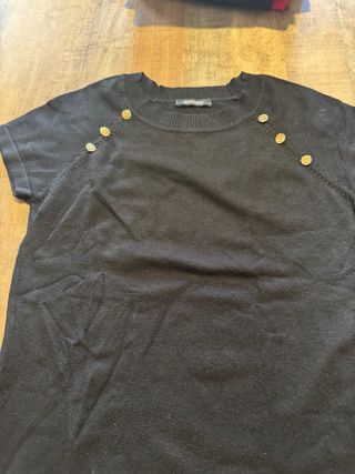 Elegante suéter de manga corta con detalles de botones dorados. - Cuello redondo. - Diseño con botones decorativos en el hombro. - Tejido suave y cómodo.