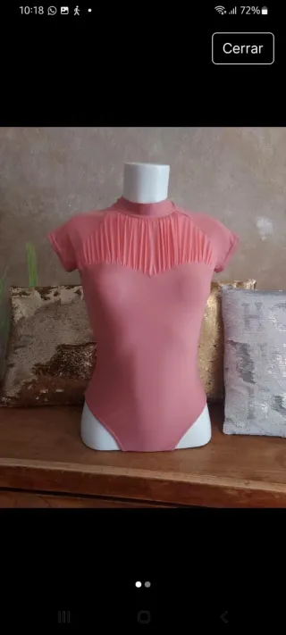 Maillot de ballet o danza color coral con un diseño elegante y detalles fruncidos en el pecho y cuello. - Manga corta. - Cuello alto. - Diseño fruncido en el escote. - Tejido elástico.