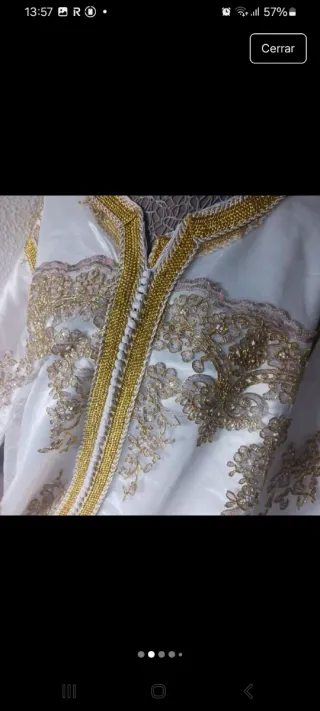 Elegante takchita vintage con intrincados bordados dorados sobre fondo blanco. Una pieza única con un diseño clásico. - Bordados detallados en hilo dorado. - Diseño de manga larga. - Cierre frontal con cordones.