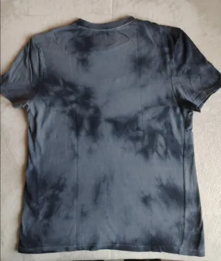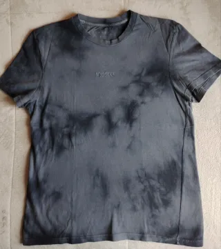 Camiseta con un diseño tie-dye en tonos negros y grises. Presenta un pequeño bordado en la parte frontal con kanji. Talla: S. Puesta una única vez. Algodón.