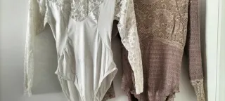 Dos bodys de encaje, muy elásticos y adaptables. - Body de encaje en tono marrón. Cuello alto redondo. Manga larga. Talla 42. Mide 72 cm largo total. Precio 10 €. - Body de encaje en tono blanco. Delicado, trasparente. Manga larga. Cuello redondo. Talla 42 . Largo total 72 cm Precio 10 €. Precio de los dos 18 € y envío gratis.