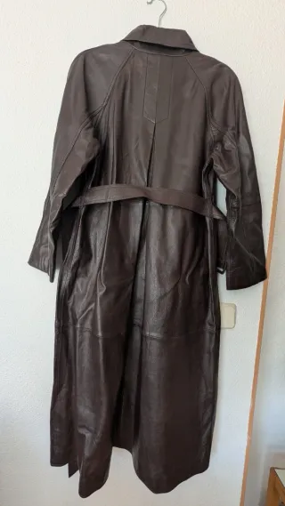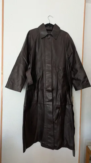 Elegante abrigo largo de piel. - Color marrón oscuro. - Diseño clásico con cuello. - Cinturón a juego para ajustar la cintura. - Cierre de botones.