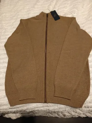 Sin estrenar, es precioso,da más talla ya que es estilo oversize, podría ser una o dos tallas más, en color beige con brillos dorados ,lo más llamativo es el entramado de hilo como está tejido ,talla S