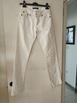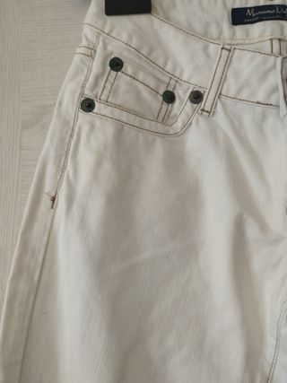 Pantalones vaqueros de Massimo Dutti en color blanco. Son de corte recto y están en muy buen estado. - Talla: No especificada en la imagen. - Cierre: Cremallera y botón. - Bolsillos: Dos delanteros y dos traseros.