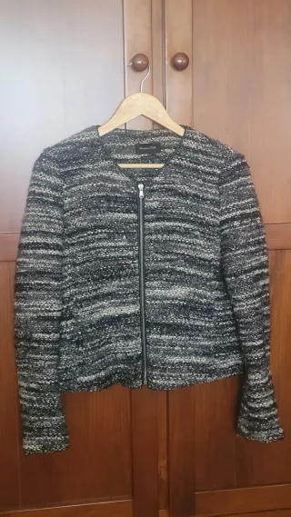 Chaqueta marca MASSIMO DUTTI, de color negro y gris. Talla 42 (talla pequeño), entallada, abrocha con cremallera frontal en negro, y también tiene cremalleras en las mangas a la altura del puño. Muy bien conservada, no tiene defectos. Mide 54 cm de largo, y 50 cm de ancho a la altura de las axilas. Composición: 53% acrílico, 22% poliester, 17% lana y 8% polyamida.