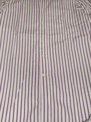 Camisa de manga larga de patrón atemporal de rayas verticales finas. La base es blanca y las rayas son de color morado. Es de diseño clasico y de talla M: Hombro 43 Pecho 53'5 Cintura 51 Cadera 53,5 Largo 80'5 Le faltan los botones de repuesto🤷, pero son fáciles de encontrar si se te perdiera alguno. Solo tiene 2 puestas, está perfecta y lista para una segunda vida👌☺️