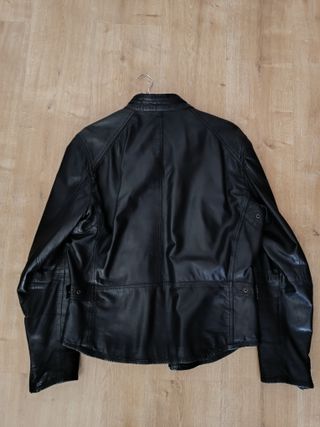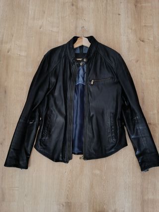Chaqueta de piel de Massimo Dutti en color negro. Se encuentra en muy buen estado. - Cierre de cremallera. - Bolsillos frontales con cremallera. - Cuello con botones a presión.