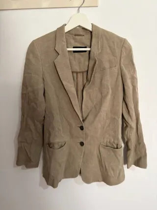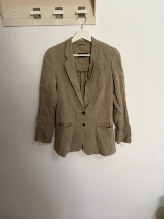 Elegante blazer de Massimo Dutti en color beige. - Diseño clásico con solapas. - Cierre de dos botones. - Bolsillos frontales. - Tejido de lino.