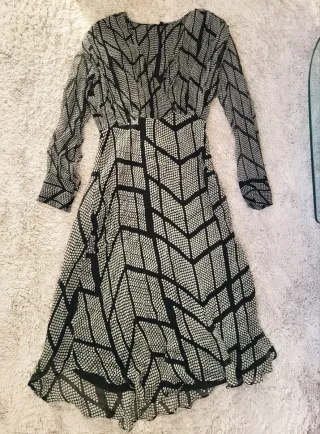 Elegante vestido de Massimo Dutti con un llamativo estampado geométrico en blanco y negro. Su diseño fluido lo hace ideal para diversas ocasiones. - Manga larga. - Largo midi. - Estampado geométrico.