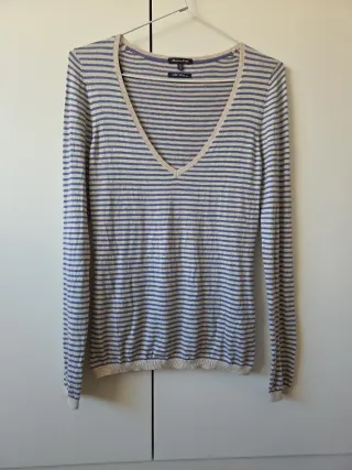 Jersey de punto fino con cuello en V y estampado de rayas beige y Azul, está en perfecto estado ya que ha tenido muy poco uso.