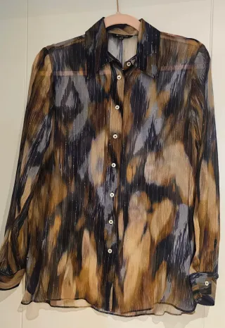 Elegante camisa de Massimo Dutti con estampado en tonos marrones y detalle hilo plateado. Tejido ligero. Talla 36. Nueva