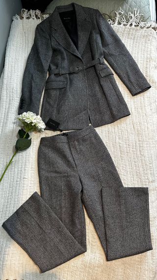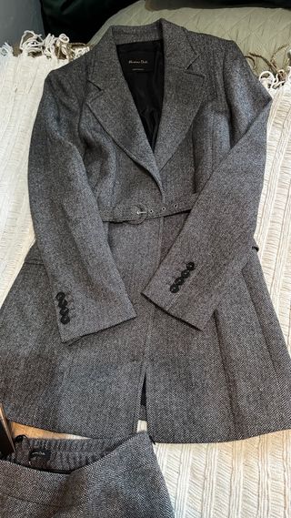 Precioso conjunto de Massimo Dutti en color gris jaspeado espiga con americana blazer con cinturon y pantalon tobillero con goma en la cintura. Pantalon con etiqueta, levita no, pero sin usar. De lana calentito calidad premium. Talla 34