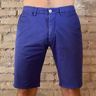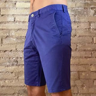 Pantalón corto de tela en tono azul. - Cintura con botón y cremallera. - Bolsillos delanteros. - Largo hasta la rodilla.