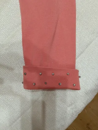 Jersey de manga larga en color coral Presenta un diseño elegante con detalles metálicos en los puños. - Puños adornados con brillantes. - Cuello redondo.