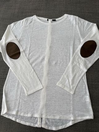 Camiseta de lino con un diseño moderno y detalles únicos. - Parches de ante en los codos. - Abertura central trasera con botones. - Corte asimétrico en el bajo. - Etiquetas cortadas